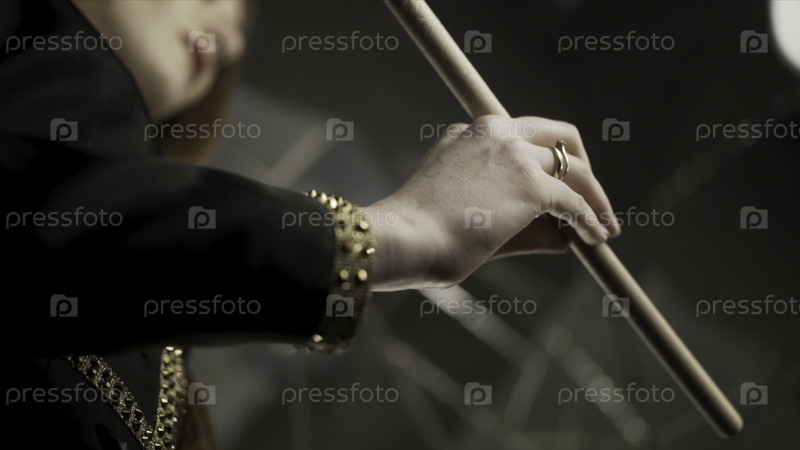 Молодая привлекательная женщина держит в руке барабанную палку и вращает ее во время музыкальной репетиции