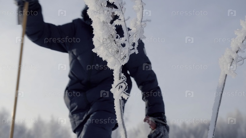 Мальчик ходит с палочками зимой. творческий. мальчик ходит зимой со скандинавскими палками. зимние спортивные поездки в солнечный день