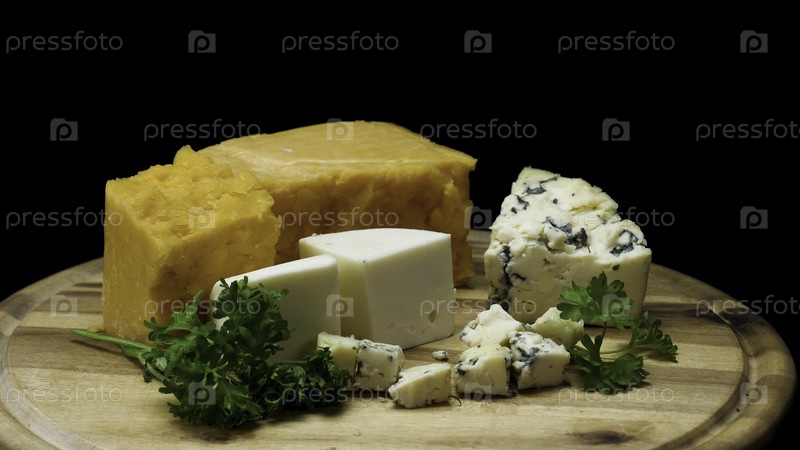 Близкие к французским вкусным старым сырам, нарезанными и подаваемыми на деревянной доске, изолированной на черном фоне