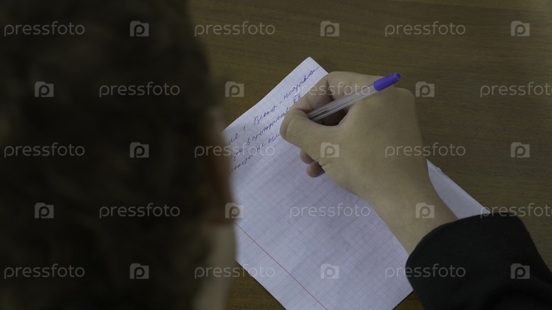 Почерк, рука пишет ручку на бумаге.Человек пишет текст на бумаге