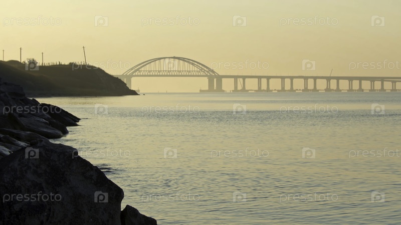 Впечатляющий вид на океан, огромный красивый мост и скалистый берег в ярком золотистом небе на заднем плане. Съемки. Красота природы, потрясающий пейзаж с эффектом расширения времени