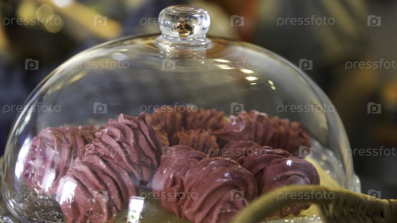 Прекрасные розовые торты, лежащие на подносе на размытом фоне