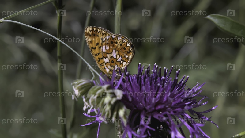 Красивая бабочка, грациозно отдыхающая на ярко-фиолетовом цвете в самом сердце природы
