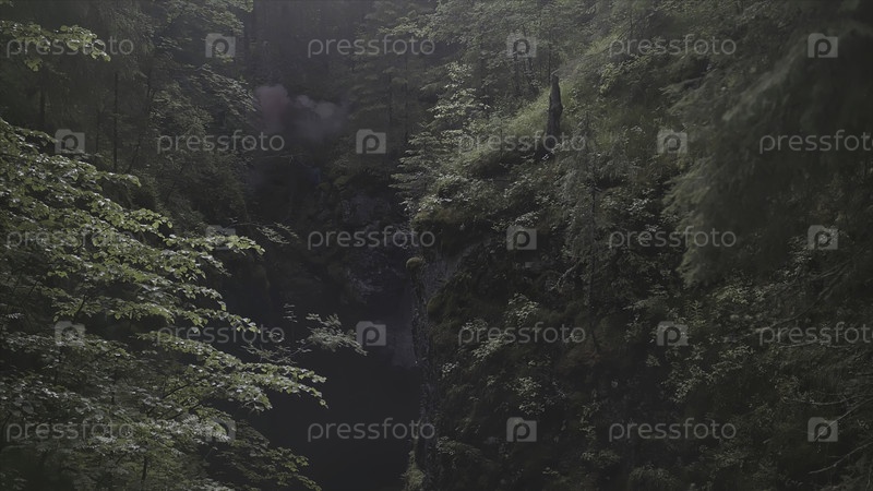 Воздух человека, стоящего в ущелье между двумя горами, покрытыми зелеными растениями и деревьями - экстремальная обстановка
