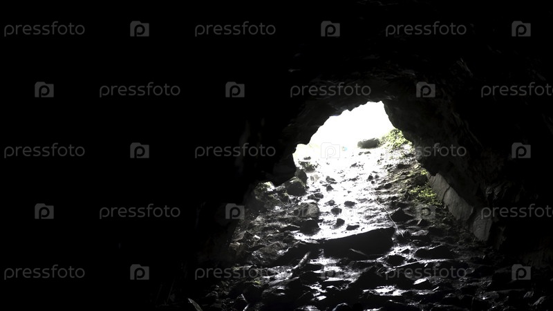 Яркий солнечный свет на выходе из темной пещеры, мистическая природа. Резервная запись. Резервные кадры. Вид изнутри подземного тоннеля или пещеры