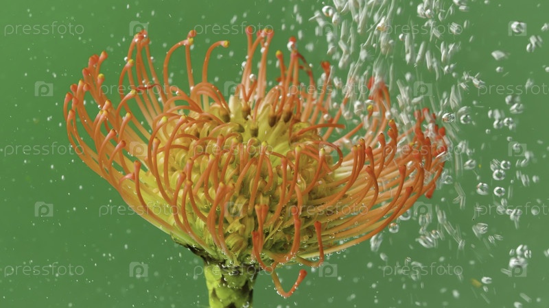 Поток пузырей на цвете под водой. резервные кадры. освежающий поток пузырьков под водой с цветком. Яркий экзотический цветок под водой с пузырями на изолированном фоне