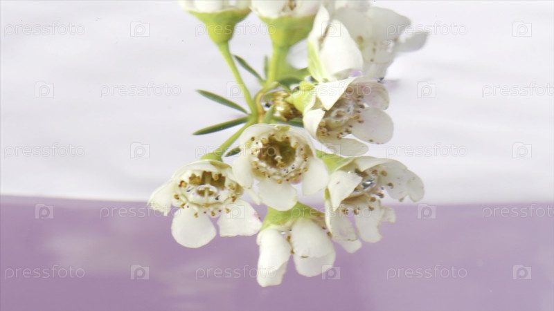Красивый нежный весенний цвет природного фона. резервные кадры. Закройте вид на цветущие белые цветы, помещенные под водой на розовом фоне