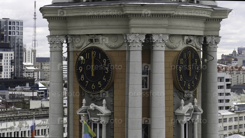 Вид с высоты птицы. Резервные кадры. Летний пейзаж серого города со часовой башней и офисами, которые стоят позади и домами в центре