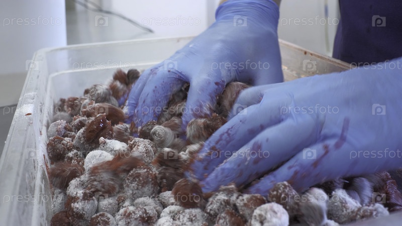 Закрытие промышленного смешивания замороженных ягод. Клип. Шеф-повар в перчатках перемешивает замерзшие ягоды. Смешает вишни с сахаром для десерта