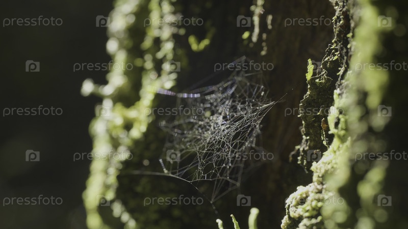 Большая паутина, на дереве, на утренней росе, на естественном фоне, очень сильная паутина
