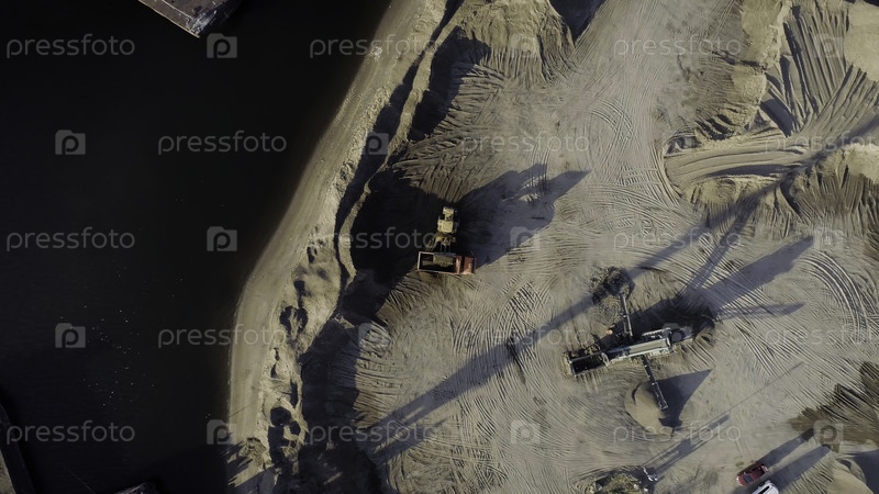 Вид с воздуха грузовиков и автомобилей в песчаном карьере Сцена Песчаная яма, загрузка вагона песком, концепция тяжелой промышленности