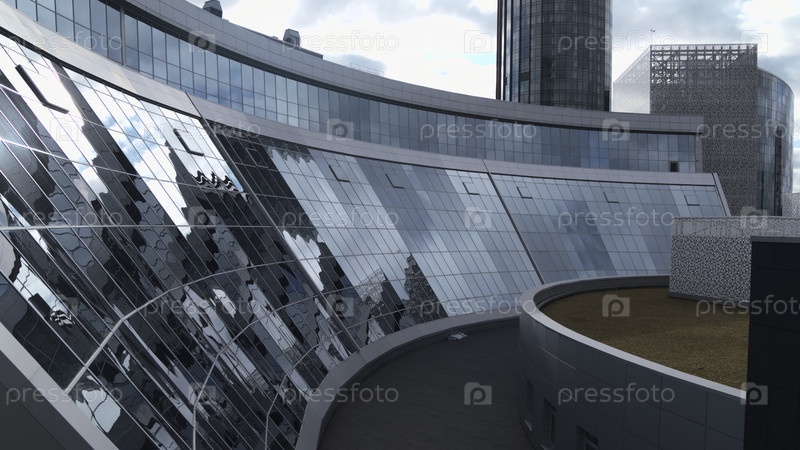 Современное здание со стеклянными окнами и отражением. Запасные кадры. Современная архитектура стеклянных зданий для офисов или культурных музеев. Красивое отражение зданий и неба в окнах современного здания