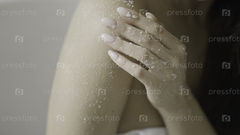Концепция ухода за телом, чувственная женщина наносит скраб на свое тело