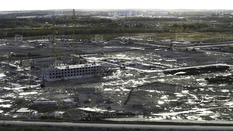 Вид с воздуха на строительную площадку за пределами города. Резервные кадры. Строительный процесс в окружении зеленых деревьев