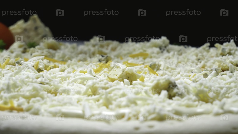 Повар наливает сыр на пиццу. Рамка. Профессиональный шеф-повар итальянской кухни в перчатках заливает обжаренный сыр над сырой пиццей. Приготовление традиционной пиццы на черном изолированном фоне