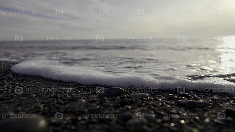 Пляж. Идите дальше. Красивые морские волны бегут вдоль камня и вы можете увидеть пену из моря, а на заднем плане можно видеть свет от солнца. Высококачественный 4k кадры