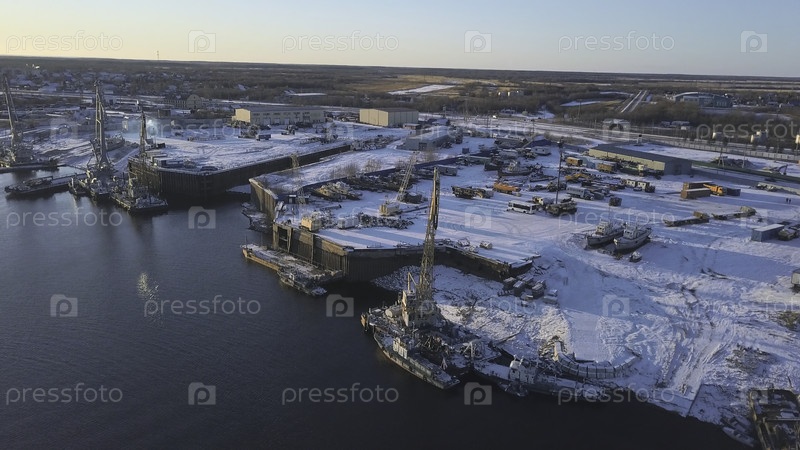 Зимний вид сверху. Прекрасный пейзаж на реке, рядом с которой стоят припаркованные корабли и большое строительное оборудование, а позади вы можете увидеть пустыню и стройплощадки