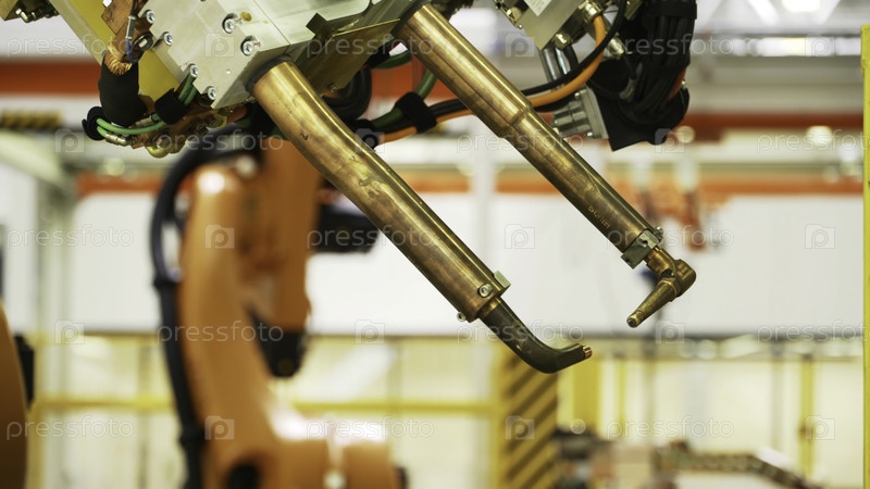 Последние технологии в производстве машин. Сцена. Роботизированные машины, работающие на производстве автомобилей и деталей. Новые технологии и робототехника в производстве