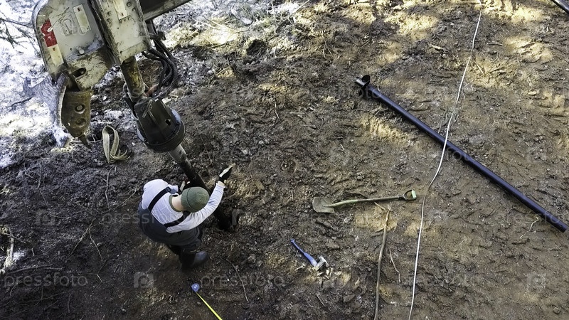 Вид беспилотника на униформированного человека, работающего в грязи со специальным оборудованием