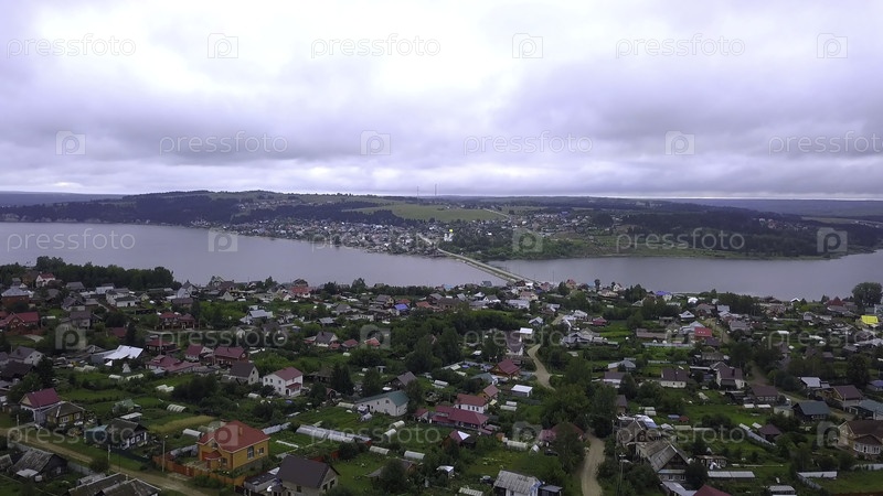 Летний вид с беспилотного летательного аппарата.Клип.Вид на небольшой город с рекой, мост над прудом с автомобилями, близлежащие парки, леса и дома и слегка облачное небо