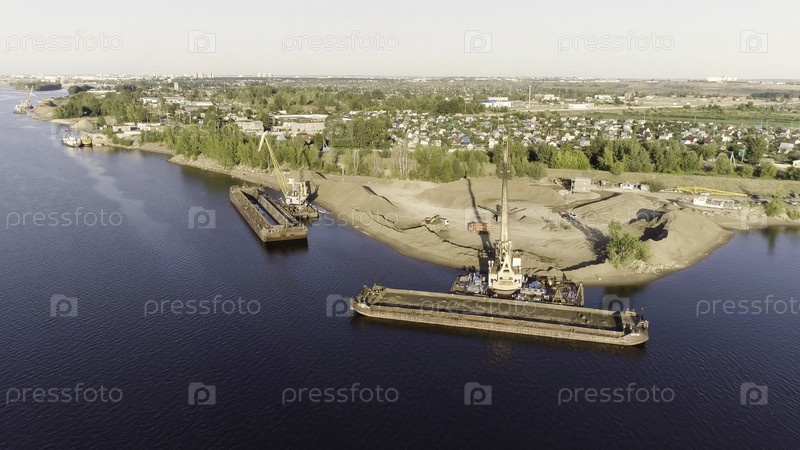 Строительные краны и грузовики на берегу. Сцена. Вид сверху на очистку строительной площадки на берегу озера. Начало строительства на озере в солнечный день