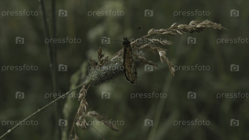 Близкий план бабочки на зеленой траве.Креативность.Прекрасная оранжевая бабочка сидит на листочке травы в зелёном лугу.Бабочка сидит на тонком листке травы.Насекомые и микромир