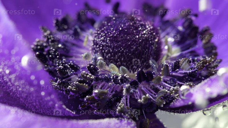 Ярко-фиолетовый цветок в воде. Скриншоты. Крупные лепестки, обернутые водой, на которых есть много капель при макрофотосъемке. Высокое качество FullHD кадры