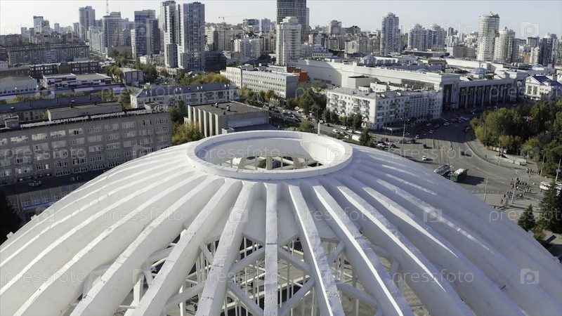 Вид с воздуха большого и красивого циркового купола, Екатеринбург, Россия. резервная запись. Жилые здания и прекрасные офисные дома в летний день
