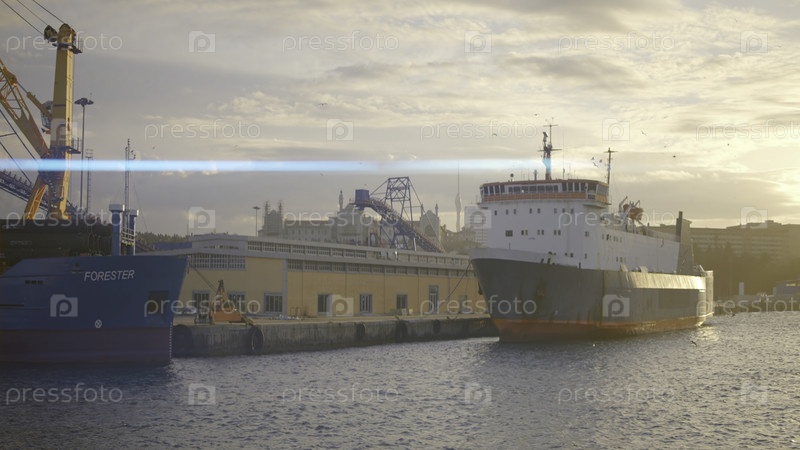 Большие грузовые суда красивы.Давайте дальше.Морской пейзаж, в котором большие водные транспорты плавают на фоне моря и яркого солнца над ним.Высококачественный 4k кадры