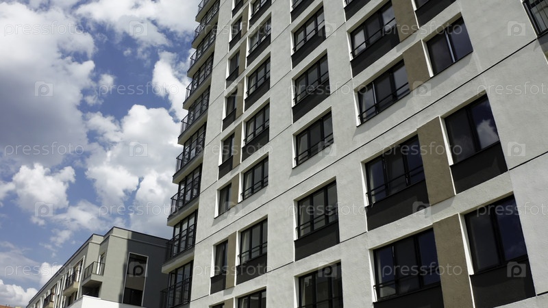 Панорамный вид на фасад жилого здания. Резервные кадры. Вид на окна современного многоквартирного дома в солнечный день. Красивый фасад с окнами жилого дома в современном комплексе