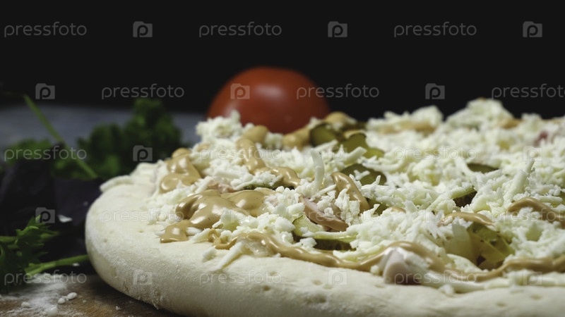 Повар готовит итальянскую пиццу из Каркаса.Профессиональный повар в перчатках кладет огурцы на пиццу.Итальянская пицца на черном фоне
