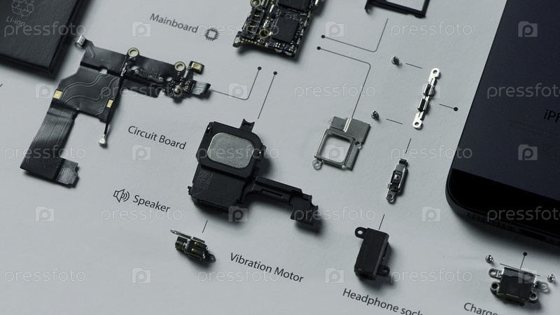Москва - Россия, 02.20.2022: закрытие деталей iPhone, представленных на доске с его именами