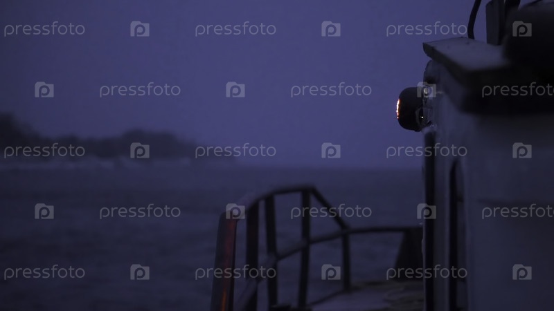 Части грузового судна. Клип. Большое судно с прицепом, которое движется в развивающихся волнах вдоль реки и несет груз темным вечером с красивым закатом солнца и фиолетовым фоном. Высококачественный персонал FullHD