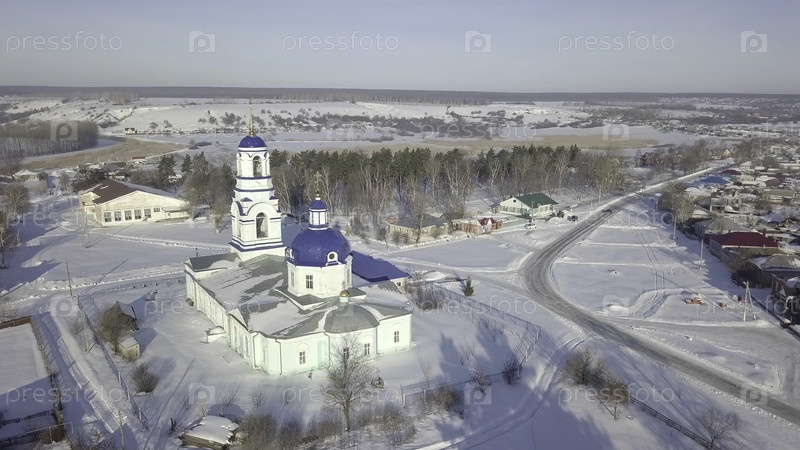 Аэрофотосъемка местной православной церкви в русской деревне с голубыми куполами и золотыми крестами в солнечный зимний день