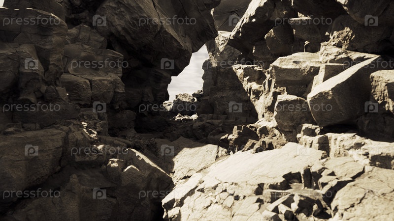 3D-фон с каменистым пейзажем. Дизайн. Пустынный скалистый ландшафт гор. Горы со скалистыми ландшафтами и долинами