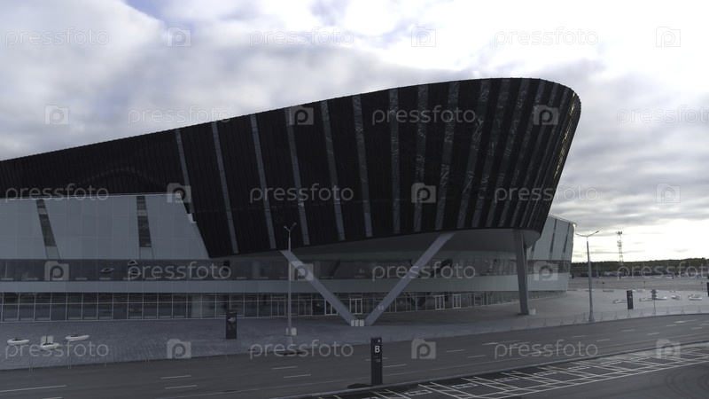 Екатеринбург, Россия - 13 мая 2022: Фасад здания выставочного центра. Резервные кадры. Современный фасад арены или здания выставочного центра. Здание Конгресс-центра ЭКСПО