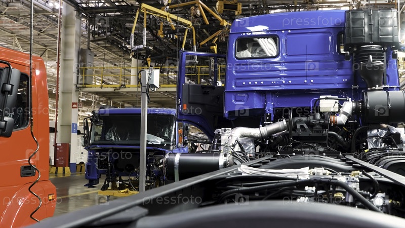 Производство автомобильной сборочной линии на заводе грузовиков 'Камаз'.Сцена.Эффект расширения времени, промышленный фон с подвешенной линией каркаса кузова, концепция машиностроения