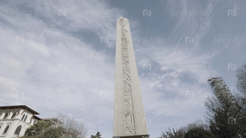 Стамбул, Турция 2 июня 2022: Нижний вид древнего обелиска. Вперед. Длинный столб памятника с древними надписями. Древний египетский обелиск Феодосия в Стамбуле