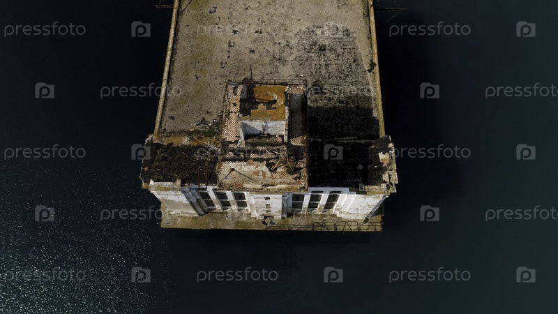 Вид с воздуха на старый ржавый пирс и голубую бирюзовую воду. стрельба. заброшенный старый бетонный пирс и морская вода