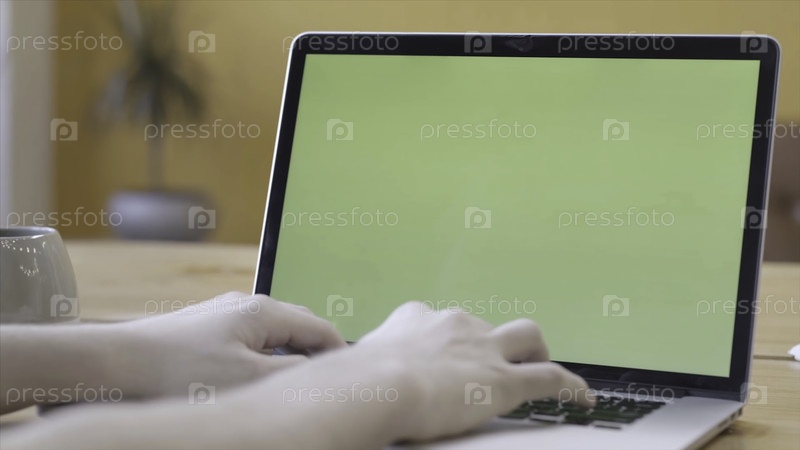 Женские руки с идеальным маникюром на клавиатуре ноутбука. зеленый цвет экрана для размещения собственного контента