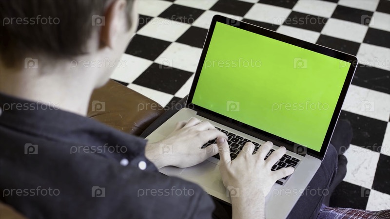 Ближайший снимок молодого человека, печатающего на ноутбуке с зеленым скриптом. резервные записи. Молодой программист или фрилансер работает на ноутбуке со зелёным экраном