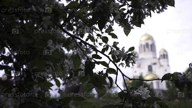 Вишневые цветки перед церковью. резервные кадры. весенний расцвет белых цветов на зеленых кустах на фоне церкви с куполами в пасмурную погоду