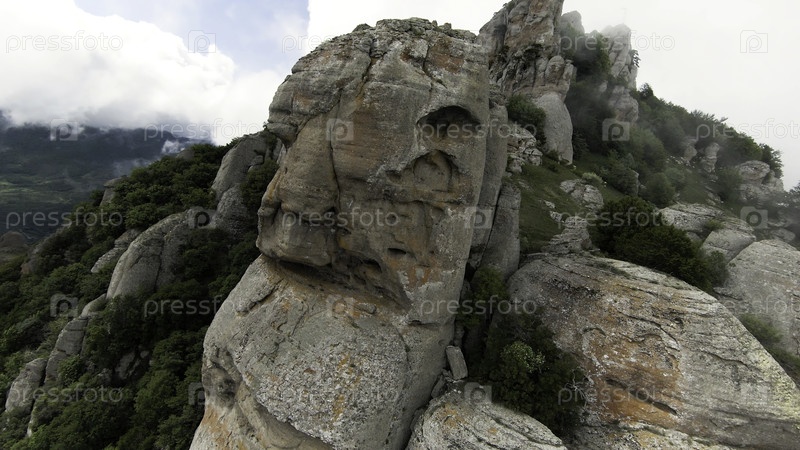 Летите над удивительными необычными скалами и зеленой травой в тумане