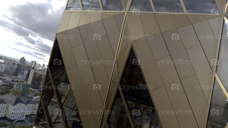 Полет вокруг сложного современного здания с геометрической формой и зеркальными окнами. Резервные кадры. Строительство с необычной архитектурой, небоскреб, офисный блок в деловом районе большого города