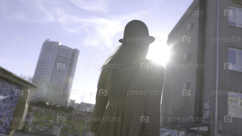 Модная молодая женщина в шляпе позирует для камеры. Продолжайте. Внешний портрет красивой молодой женщины с длинными волосами. Модель смотрит на камеру. Женская мода