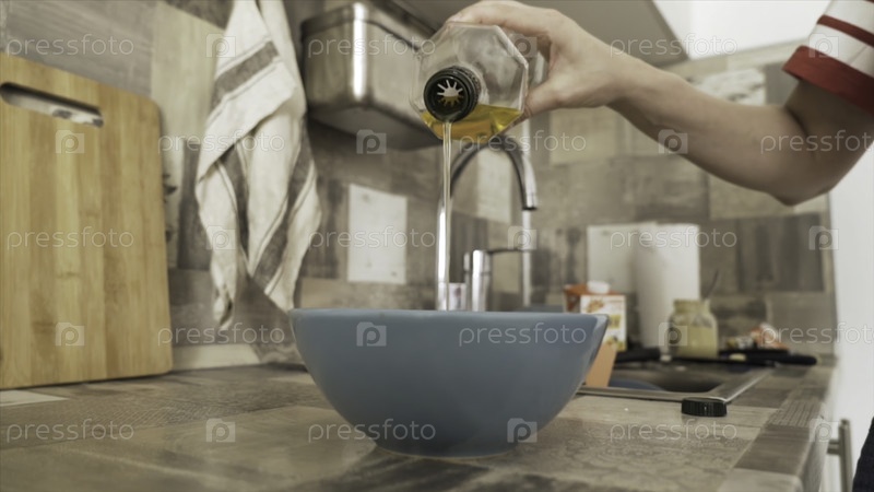 Закройте руку женщины, налив оливковое масло в тарелку во время приготовления пищи на кухне