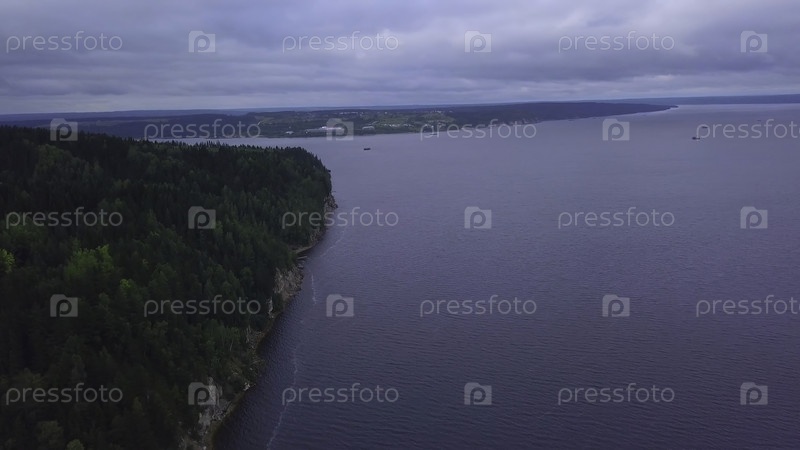 Вид с воздуха на крутую скалу над спокойной поверхностью реки. Клип. Зеленый сосновый лес на холмах и поверхности воды