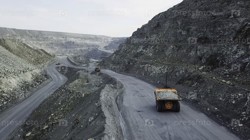 Сверху видно вождение оранжевого грузовика с обломками на открытой дорожной яме Тяжёлый транспорт в горнодобывающей промышленности