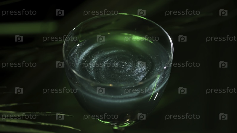 Винный стакан с зелёным коктейлем на тёмно-зеленом фоне с листьями растений. резервные кадры. Закройте алкогольный напиток зеленого цвета со светящимися частицами