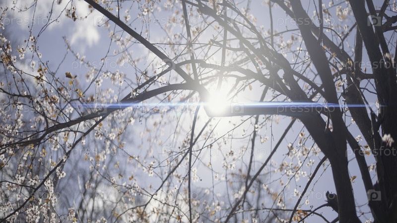 Красивые ветви цветущего дерева против неба. идите вперед. ветки цветущего дерева качаются на ветре в солнечный день. красивые ветви деревьев с цветами на фоне яркого солнца и голубого неба